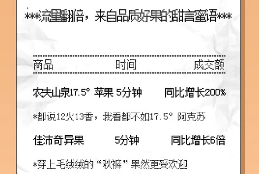 再来看流量翻倍的品质好果的战绩,都说12火13香,在爱尝鲜的吃货们眼中,都不如农夫山泉17.5℃阿克苏苹果和佳沛奇异果的鲜美滋养!用时5分钟,17.5℃阿克苏苹果成交额同比增长200%,佳沛奇异果成交额同比增长6倍,果然,冬天来了自带“秋裤”的奇异果更受欢迎,“一招鲜”get流量翻倍的秘密。