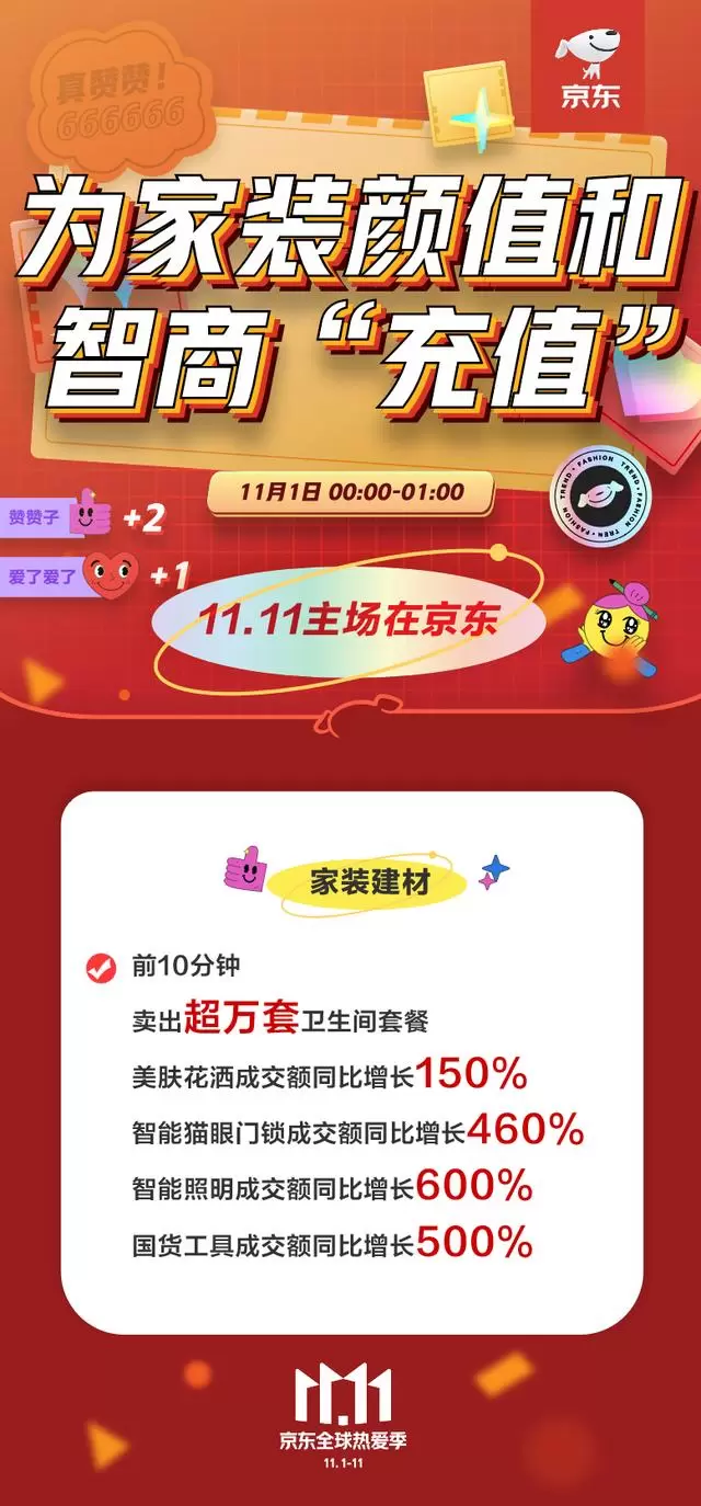 京东618发起的"卫生间革命"热度延续至今,11月1日前10分钟,卖出超万套卫生间套餐,其中卫浴套餐成交额同比增长200%,诺贝尔卫浴瓷砖套餐成交额同比增长726%。与此同时,美肤花洒成交额同比增长150%;卫浴收纳用品成交额同比增长100%;国际卫浴成交额同比增长120%;无主灯照明产品成交额同比增长300%,其中氛围照明成交额同比增长600%。