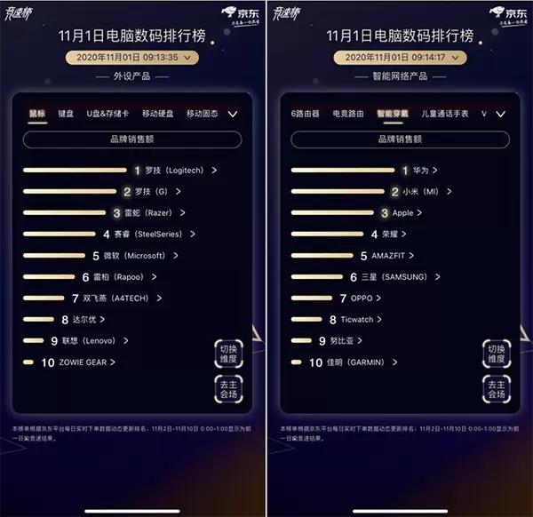 在外设和智能网络品牌竞逐中,罗技力压群雄争得键、鼠两大榜单冠军;闪迪在U盘&储存卡、移动固态榜稳占第一;西部数据和微软分别在移动硬盘和游戏设备榜单领跑。智能网络方面,华为的高速路由器、Wi-Fi6路由器、智能穿戴都颇受消费者喜爱,颇多优惠和爆款火爆销售协助品牌占领竞速榜首,而小米和普联分别在电竞路由器和网络设备榜单一马当先。