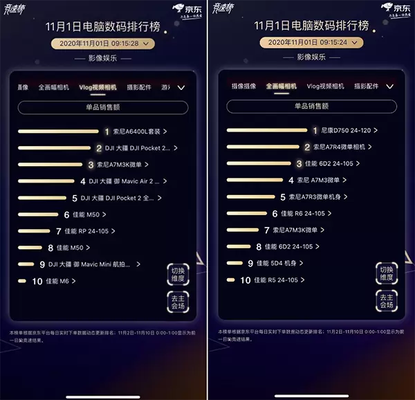 在深受广大年轻潮流用户关注的耳机音箱品类中,索尼再次展现行业主导力,独占影音娱乐、耳机、电竞耳机、真无线耳机、HiFi音频5大榜单榜首,制霸全场。不仅如此,索尼在“索佳尼”三分天下的影像娱乐品类中,凭借明星产品索尼A6400L领跑Vlog视频相机榜。尼康D750 24-120在全画幅相机榜稳居第一;佳能在品牌销售额方面,站稳摄影摄像榜No.1。