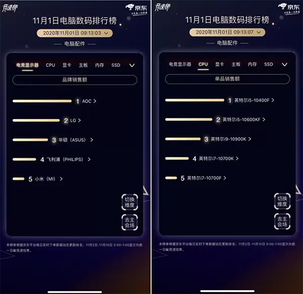 如果说PC榜的形势是一骑绝尘,那么电脑配件品类可谓百花竞放,争奇斗艳。电脑显示器榜单AOC暂居领先位置,LG、华硕紧随其后;而英特尔稳居处理器市场高地,凭借5款明星产品包揽了CPU榜单TOP5,尽显王者风范;华硕在主板、显卡、机电三大榜单折桂;金士顿、三星分别在内存和SSD两大榜单登上冠军宝座,各个品类铆足实力为消费者带来十足优惠。