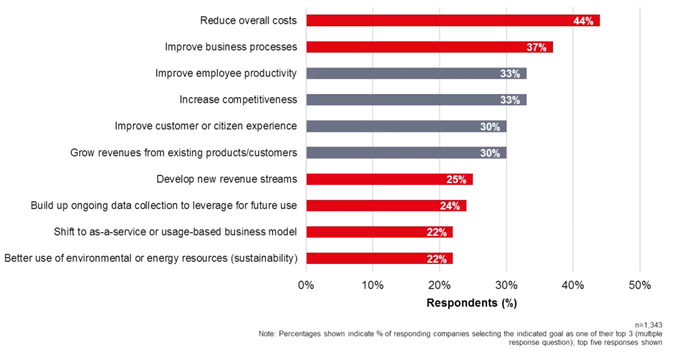 但是,在很多情况下,进行物联网部署的驱动力是一致的:企业正在寻求降低成本,以及更高的效率和生产力。约三分之一的受访者也非常重视使用物联网来提高竞争力或客户体验。即使在制造业这样的传统B2B领域,这也是许多企业的关键物联网目标,来自物联网的可持续性和新收入增长也很受关注,虽然对于多数企业来说实现这些还为时尚早。