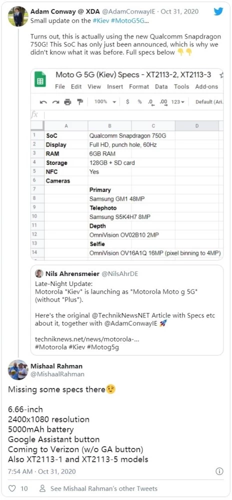 据悉,Moto G 5G 将搭载新的骁龙 750G 芯片组,能够以比较低的价格提供 5G 支持,包括 mmWave 和 AI 噪点抑制,该处理器首发于小米 10T Lite。