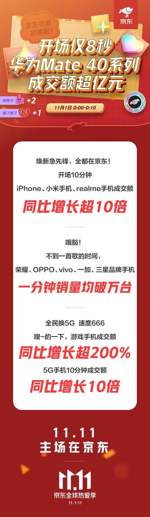 京东11.11开门红打响头炮 华为Mate 40系列成交额8秒破亿