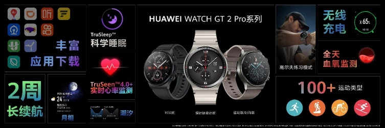 华为Watch GT2 Pro系列新品同步亮相。华为Watch GT2 Pro ECG款,作为华为首款获得国家药品监督管理局(NMPA)二类医疗器械注册认证的智能穿戴设备新增心电采集功能。另外华为Watch GT2 Pro ECG款还加入了血管健康研究,升级TruSeen TM4.0+心率监测技术,支持全天候心率监测、全天候血氧饱和度监测,帮助用户建立主动健康的生活方式。此外,该系列新品均采用钛金属表身、蓝宝石玻璃镜面、精密陶瓷背壳等高端材质设计,带来更高品质体验;新增专业滑雪和高尔夫练习场模式,支持无线快充和两周长续航,助力都市高端人群享受运动乐趣。