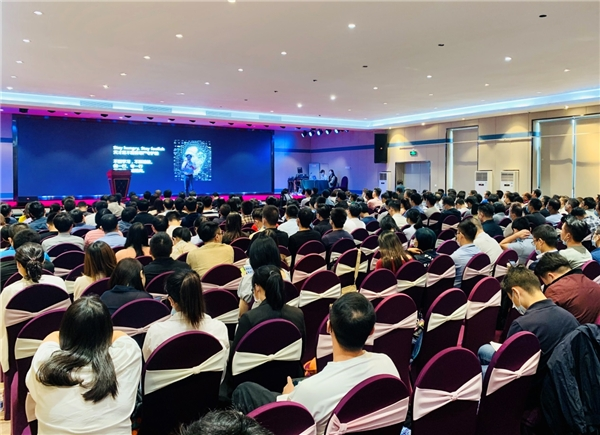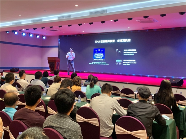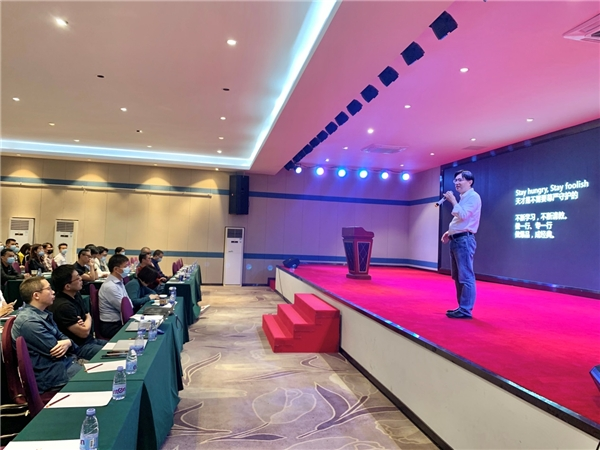 谢冠宏作为万魔学院第一堂课的主讲人,与企业员工分享万魔声学企业文化