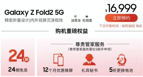 三星Galaxy Z Fold2 5G在三星网上商城、天猫、京东、苏宁等电商平台的三星手机官方旗舰店以及全国指定线下门店都推出了24期分期免息活动。对于一次性支付三星Galaxy Z Fold2 5G全款感到有压力的朋友们来说,选择免息分期购买之后,最少一天花费二十多块钱,就能体验到三星Galaxy Z Fold2 5G这款手机的独特魅力,大大减轻了消费者们的购机负担。