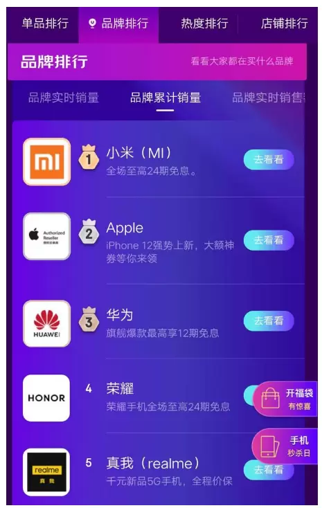 竞速首日,各大手机品牌你追我赶角逐异常激烈!截止11月1日12:00,小米手机表现强劲,位列品牌累计销量排行榜首位,Apple紧跟其后位居第二位,华为则排名第三位。此外,荣耀、小米、oppo、一加等手机品牌也均榜上有名。而在销售额排名方面,Apple则雄踞销售额第一名,小米与华为品牌则紧随其后。