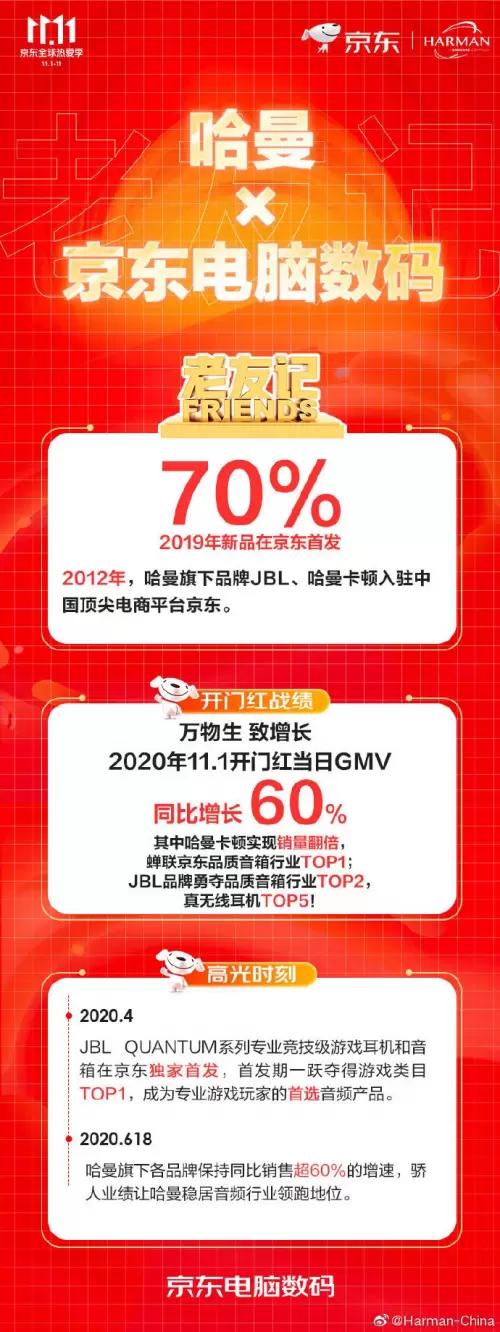 2012年,哈曼旗下JBL和harman/kardo等众多品牌入驻京东,在京东全方位资源的支持下,成功开拓了年轻一代的消费市场,并在之后几年的销售中屡获佳绩。