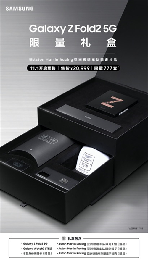 一年一度的双十一已经渐渐拉开帷幕,此时正是入手一台心仪手机的最佳时刻。而当下最受关注的手机当属三星全新一代折叠屏手机Galaxy Z Fold2 5G。自上市以来,它一直受到消费者的热烈追捧,虽然官方不断补货,但依旧随售随罄,受欢迎程度可见一斑。不负热爱,今年双十一期间,三星推出三星Galaxy Z Fold2 5G限量礼盒777套——赠Aston Martin Racing亚洲极速车队限定礼品,为喜爱挑战极限,抒写极致热爱的消费者带来全新高端生活方式。11月1日,三星Galaxy Z Fold2 5G限量礼盒正式开启全款预约,消费者可前往三星网上商城、京东、天猫、苏宁易购的三星官方旗舰店以及指定线下门店进行预约订购。