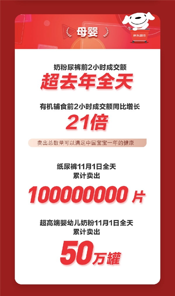 母婴品类方面,奶粉尿裤品类前2小时成交额超去年全天,有机辅食前2小时成交额同比增长21倍,卖出总数量可以满足中国宝宝一年的健康添加,纸尿裤11月1日全天累计卖出一亿片,超高端婴幼儿奶粉全天累计卖出50万罐。