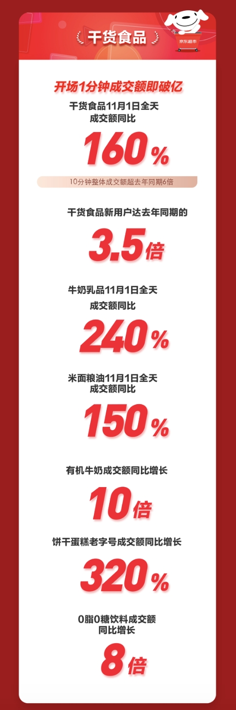 作为京东超市的王牌品类,干货食品毫无悬念地秀出傲人战绩:11月1日全天成交额同比增长160%。在民生消费向线上转移的趋势下,京东超市凭借可靠的产品品质和极致的服务体验成为大众消费首选。牛奶乳品11月1日全天成交额同比增长240%,米面粮油全天成交额同比增长150%,有机牛奶成交额同比增长10倍,饼干蛋糕老字号成交额同比增长320%,0脂0糖饮料成交额同比增长8倍。