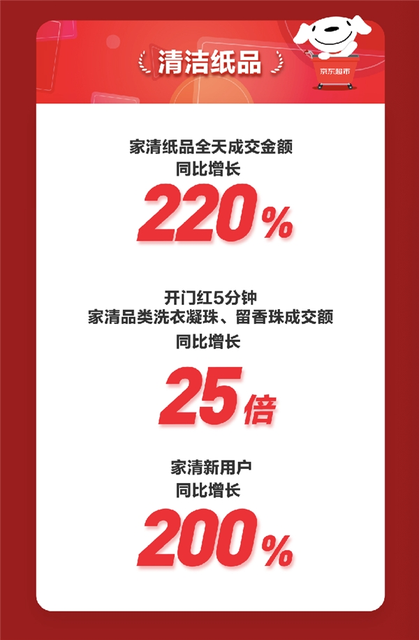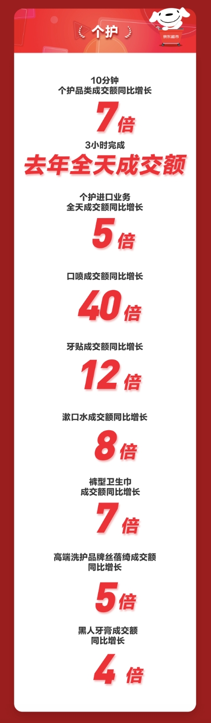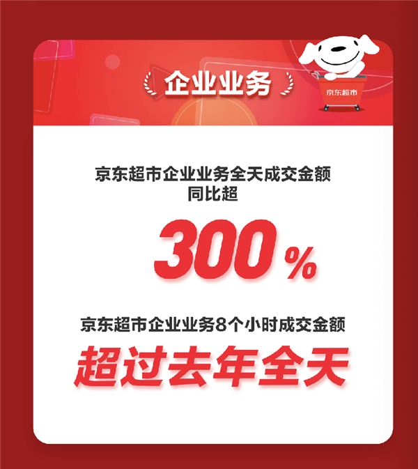 企业业务方面,京东超市企业业务全天成交金额同比增长超300%,京东超市企业业务8小时成交额金超过去年全天。