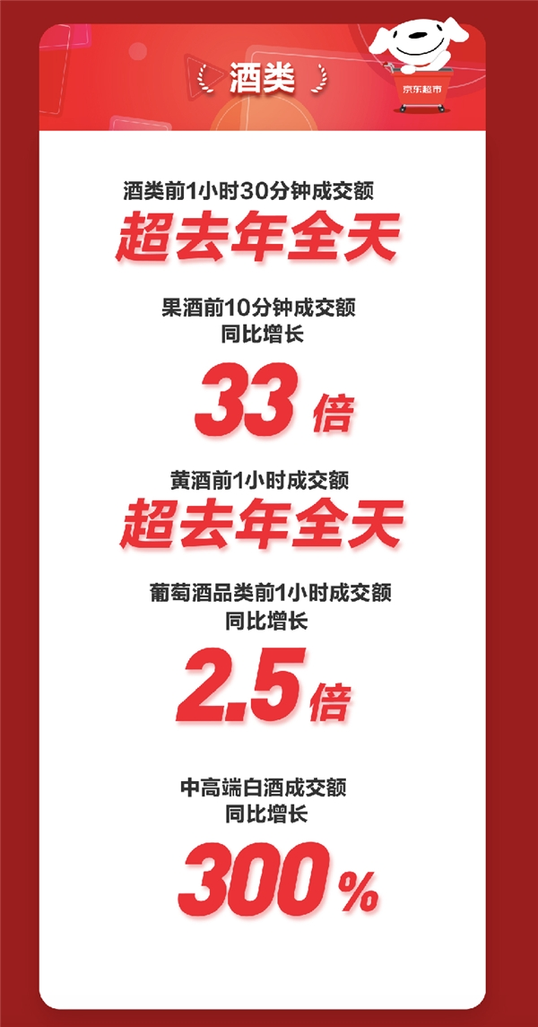 酒类方面,11月1日前1小时30分钟京东超市酒类成交额超去年全天。其中,前10分钟果酒成交额同比增长33倍;黄酒前1小时成交额超去年全天;葡萄酒品类前1小时成交额同比增长2.5倍;11月1日全天,中高端白酒成交额同比增长300%。