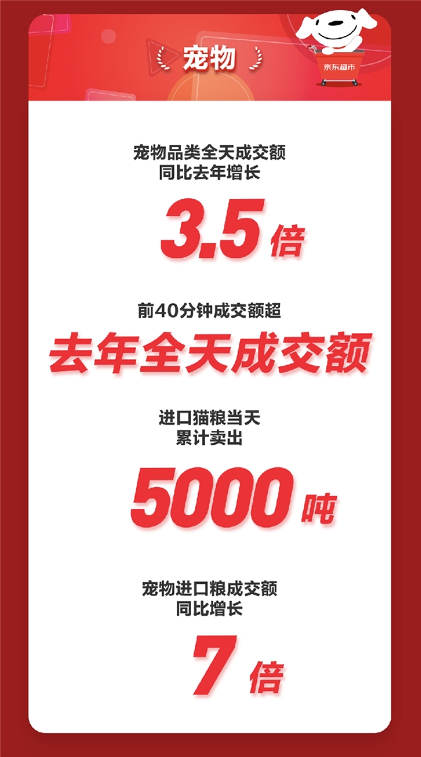“它经济”崛起下,宠物品类迎来发展“黄金时代”。11月1日开场前40分钟,京东超市宠物品类成交额超去年全天成交额,全天整体成交额同比去年增长3.5倍。猫粮全天累计卖出5000吨,宠物进口粮成交额同比增长7倍。