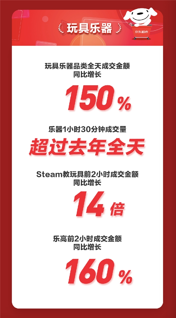玩具乐器品类增速行业领先,11月1日,玩具乐器品类整体成交额同比增长150%。其中,乐器1小时30分钟成交额超过去年全天;Steam教玩具前2小时成交额同比增长14倍,乐高前2小时成交金额同比增长160%。