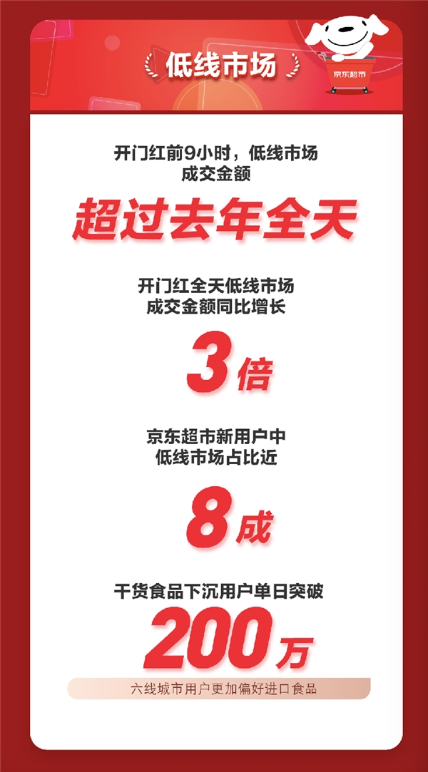 低线市场方面,开门红前9小时,低线市场成交金额超过去年全天,开门红全天低线市场成交金额同比增长3倍,京东超市新用户中低线市场占比近8成,干货食品下沉用户单日突破200万,六线城市用户更加偏好进口食品。