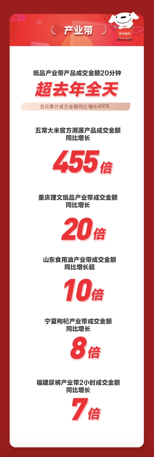 产业带方面,纸品产业带产品成交金额20分钟超去年全天,当日累计成交金额同比增长400%,五常大米官方溯源产品成交金额同比增长455倍,重庆理文纸品产业带成交金额同比增长20倍,山东食用油产业带成交金额同比增长超10倍,宁夏枸杞产业带成交金额同比增长8倍,福建尿裤产业带2小时成交金额同比增长7倍。
