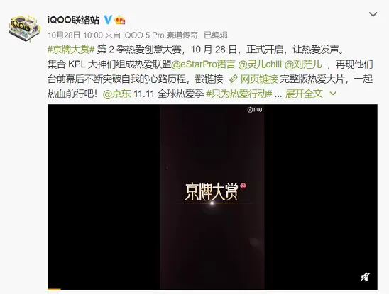 京牌大赏从去年推出就获得了业内的一致认可。如今京牌大赏第2季正式开启,这次的京牌大赏活动的主题是“让热爱发声”,在众多短片中,我们看到了一个熟悉的身影——iQOO,它也用自己的方式表达了对“热爱”的理解。