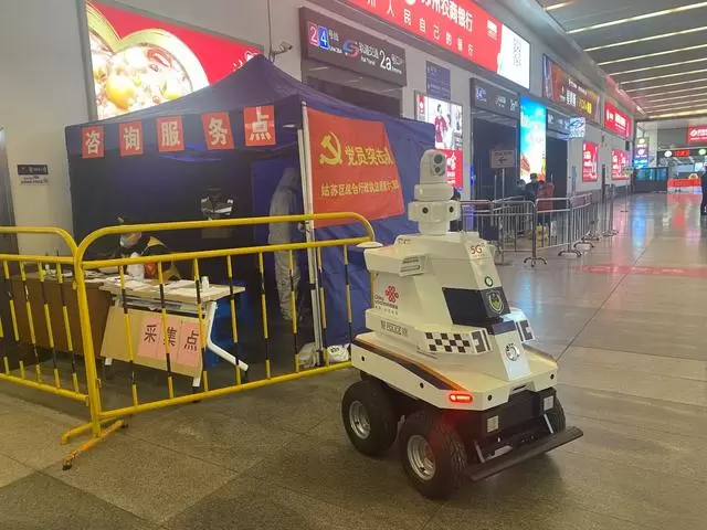 疫情机器人在联通5G信号支撑下正在执勤