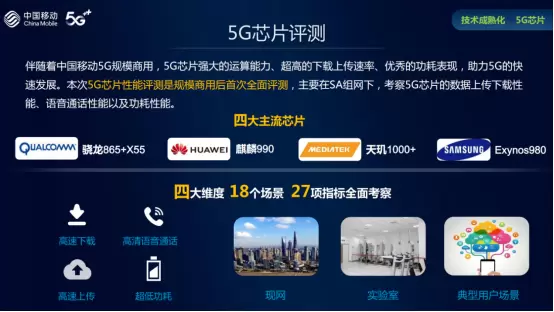 对截止到今年5月的上市产品进行全面评测,包括四大主流5G芯片和41款5G手机。其中5G芯片的评测是在SA组网模式下,考察芯片的数据上传下载性能、语音通话和功耗表现,评测的四大主流5G芯片包括高通骁龙865+X55、华为麒麟990、联发科天玑1000+以及三星Exynos980。