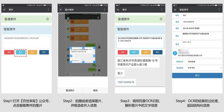 确实,不少寄件信息是以名片、截图、照片等无法复制、粘贴的形式呈现的,寄件人只能根据图片中的订单信息,手动将收发件人姓名、电话、省、市、区、详细地址等信息逐个录入指定位置中,才能完成一个快递面单信息的输入。同时,在传统寄件人实名认证环节,也需要手动输入姓名、身份证号等信息。此外,填写错误的地址信息,需要人工校正。 整个寄件环节操作繁琐,耗费时间长、效率低下。为解决此类问题,百度大脑相关技术已形成成熟的解决方案。
