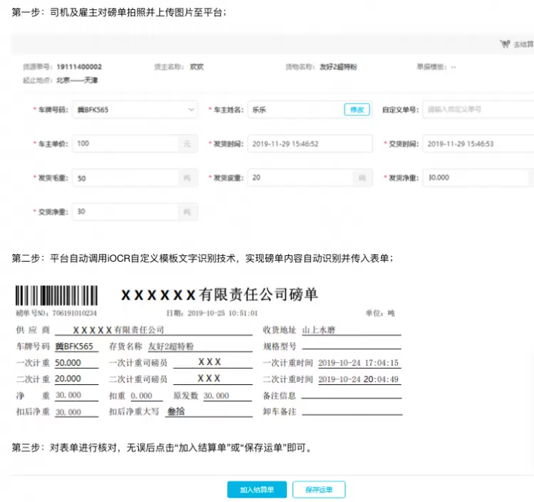 在货运物流场景中,往往会涉及众多纸质单据及证明材料,用以证明物流过程的真实性以及核验运输货物的数量,且装卸货物时间较长、流程繁琐,诸多因素导致货物运输效率低下。磅单是货运物流行业的重要凭据之一,此前磅单均采用线下纸质方式出具,且样式多种多样。以往在业务开展过程中,为了确保磅单数据与运单数据的一致性,需要由用户将磅单数量信息录入系统,再通过平台进行人工审核,既低效又容易出现错误,且增加了审核人力成本。因此,让磅单数据高效、快速、准确的录入系统,让货运物流行业实现全流程数据线上化是众多物流企业的核心需求。
