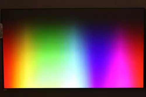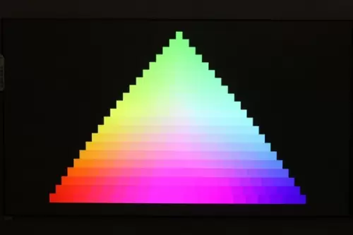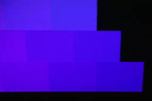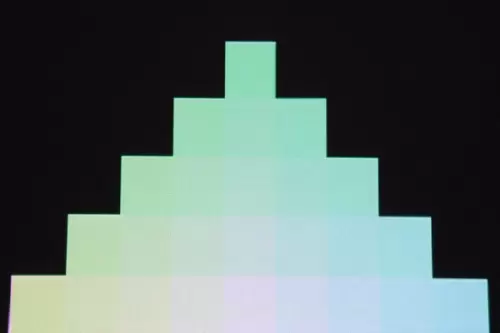 色彩过渡测试中,峰米激光影院4K Max的色阶图各方格过度层次分明,蓝色、红色、绿色的尖端处每个格子的分隔都很明显,这表示峰米4K Max的三原色的表现能力都很好。一般液晶电视在这张图的测试中,其绿色最尖端的分隔会不明显,因为液晶屏普遍有绿色表现较弱的情况。