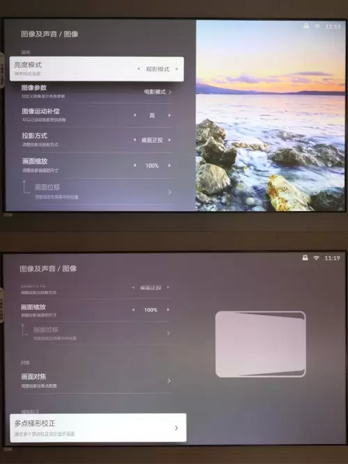 系统提供了丰富的图像、声音调节设置,用户可以根据自己的需求去调整。投影方面也提供了常规的对焦、校正等功能。