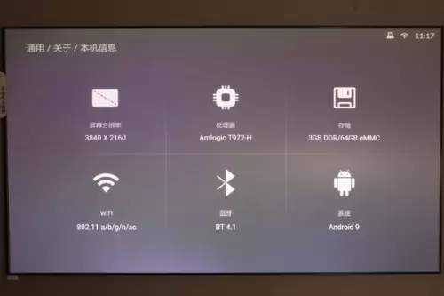 在系统设置里,我们可以看到峰米激光影院4K Max的配置信息,它采用Amlogic T972-H处理器,搭配3+64GB存储组合,在电视产品中属于中高端配置。