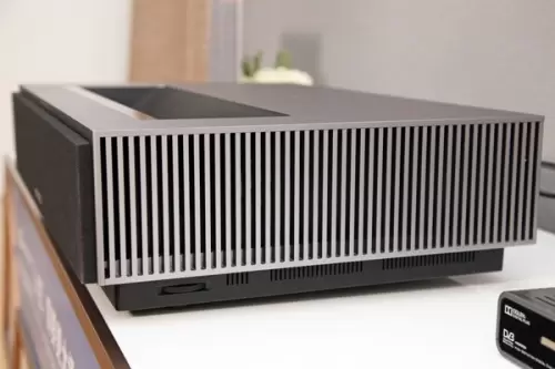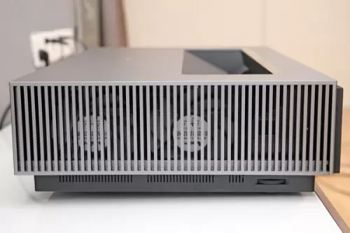 峰米激光影院4K Max的机身为金属材质,很有利于散热。金属机身重量颇沉,很是稳重,不会轻易被移动。机身出风口在左侧,右侧是进风口。