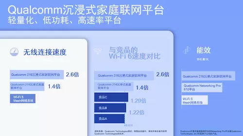 当任何设备都能享受没有被过度衰减的网络,网络性能自然得到了提高。高通还在该平台上针对Wi-Fi 6以及Wi-Fi 6E进行160 MHz信道的支持,使得高带宽的应用得到更好的服务性能。高通产品经理叶思崑表示,与竞品的Wi-Fi 6速度对比,其中高通214平台是竞品的1.4倍,高通216平台是竞品的2.6倍。