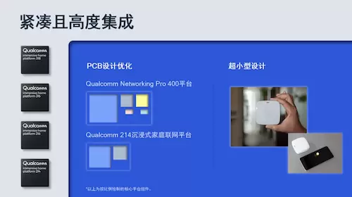 高通沉浸式家庭联网平台让芯片外的设计也变得更加简单,使得设备的整体体积可以变得非常小巧,高通目前也针对该平台提供了小型、紧凑的参考设计,让路由器不再张牙舞爪的同时,还可以做到只有手掌般大小。用户不再需要为它专门腾出过多的空间,它也不再会是家居布置中那个碍眼的存在。