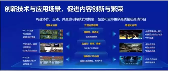 具体而言,第一层是2D转3D,通过技术将现有的海量视频做4K修复及3D化,在保护版权的前提下,快速提供类似IMAX影院的大屏观影体验;第二层是构建VR社交场景内容,针对用户有付费意愿、且具备社交互动基因的内容建立新的用户付费场景,特别是教育和娱乐领域,比如智慧课堂,商场、社区的VR自主机;第三是丰富常态化、周期性的VR直播内容,通过体育赛事、演唱会、网络直播等热点事件,吸引和培养新用户体验超高清内容的习惯,为用户持续使用VR等超高清内容服务构建粘性。