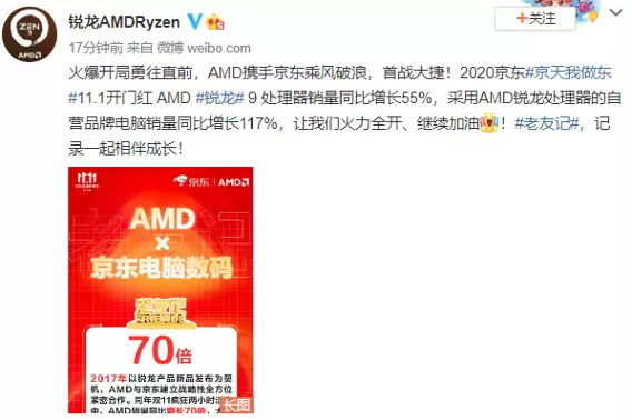 时间回到2017年,AMD在京东首发锐龙产品,一炮而红。11月7日AMD品牌日期间,单日份额占比69%,销额同比增长31倍;当年京东11.11疯狂两小时活动中,AMD销量同比增长700%,大获成功。