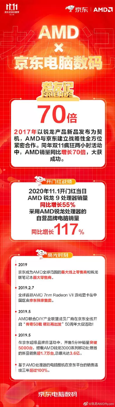 2019年,全球首款AMD 7nm RadeonTM VII 游戏显卡在中国区由京东商城独家售卖,同年5月,AMD联合DIY产业联盟成员厂商在京东全线开启“传奇50载 精彩再出发”50周年大促活动,并在同月的京东超级品牌日活动中,实现开售5分钟销量突破5000台,搭载AMD锐龙3000系列移动处理器的新品销售超1.7万台的业绩。