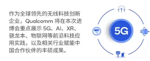 2018年第一届进博会举办时,高通在其展台展示了智能手机形态的5G移动测试终端,可用于给全球的运营商进行互联互通测试的机型。当年,高通还与中国产业伙伴联合发起“5G领航计划”,包括联想、OPPO、vivo、小米、中兴、闻泰等企业,推动5G手机等终端的开发。