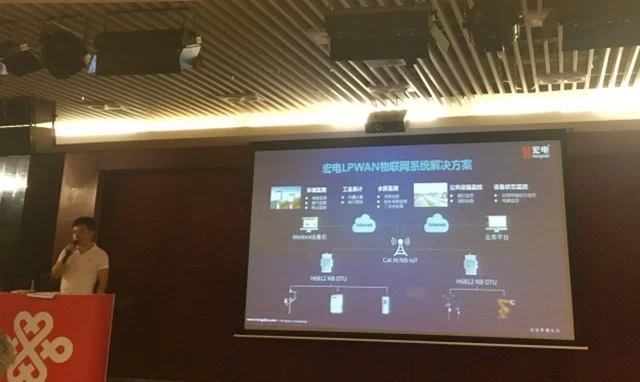 宏电股份销售总监刘秋勇致辞中分享NB-IOT低功耗广域网作为近两年才开始进入大众视野的物联网技术,其规模化商用势必能有力促进物联网产业的爆发性增长。宏电股份公司在国内最早基于移动通信技术自主研发M2M通信产品并针对行业客户提供快速定制的应用级解决方案,在这个领域耕耘了20年,拥有融合物联网、云计算、大数据、边缘计算、AI等各种信息技术与行业专有技术,提供终端、平台、应用定制一站式物联网产品与服务的业务能力,中国联通作为宏电重要合作伙伴,将基于各自的产品业务优势共同发力布局物联网。