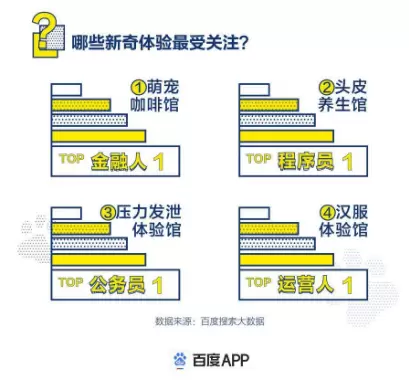百度搜索大数据显示,金融人对萌宠咖啡馆这一新奇体验充满热爱,程序员和公务员最爱的分别是头皮养生馆和压力发泄体验馆,作为互联网支柱角色的运营人,最喜爱的则是汉服体验馆。