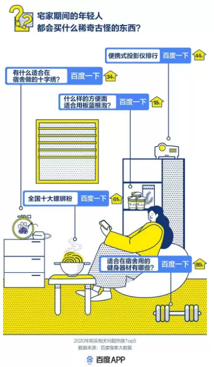 宅在室内,但这并不能阻挡年轻人“不安分”的心。百度搜索大数据显示,“有什么适合在宿舍做的十字绣?”、“什么样的方便面适合用板蓝根泡?”“全国十大螺狮粉”等问题成为2020年购买相关问题热搜Top5。千金难买我乐意的动力驱使下,年轻人充满个性化的悦己型消费正当时。