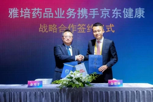 雅培药品业务中国区总经理金方千(左)、京东健康医药部总经理兼战略与投资负责人金恩林(右)