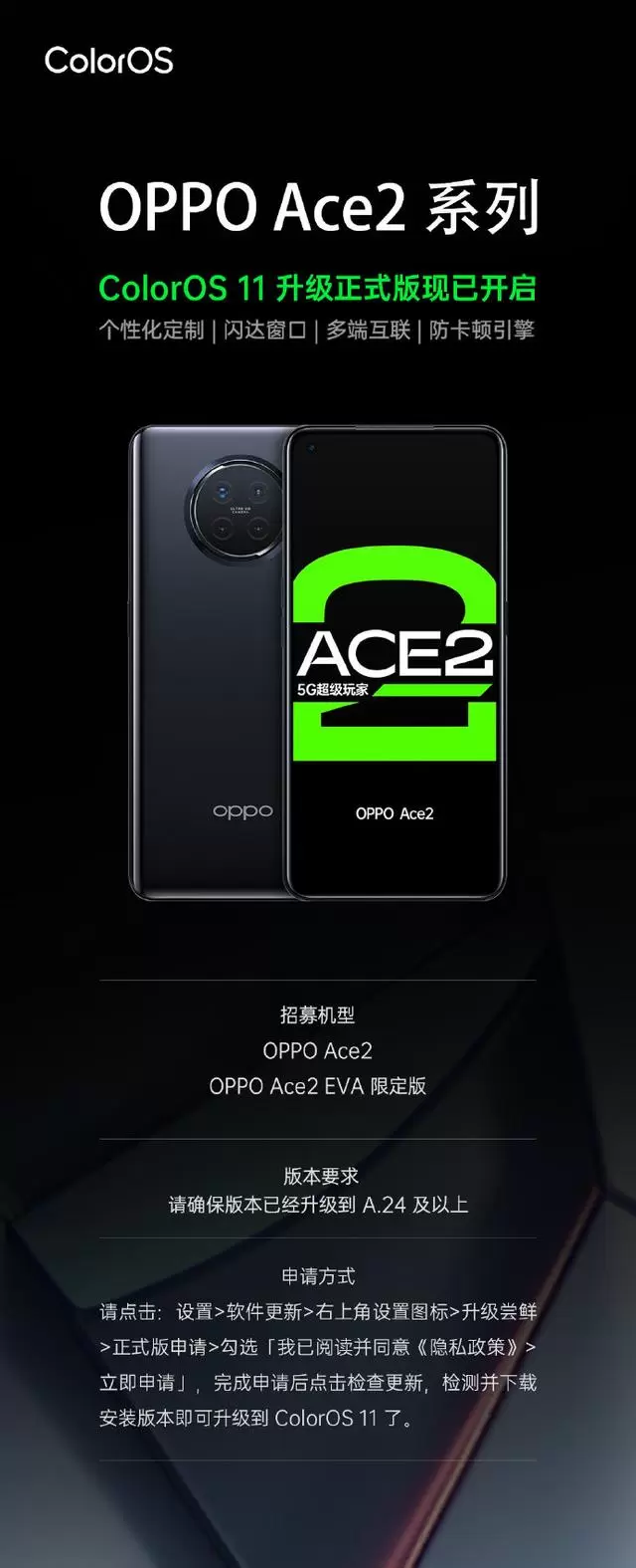 2020 年 11 月 9 日,ColorOS 官方宣布为 OPPO Ace2 系列推送 ColorOS 11 正式版,这也是继 OPPO Find X2 系列后,第二个迎来ColorOS 11 正式版升级的系列机型。ColorOS 11 正式版均基于安卓 11 正式版开发,率先为用户带来安卓 11 正式版体验。
