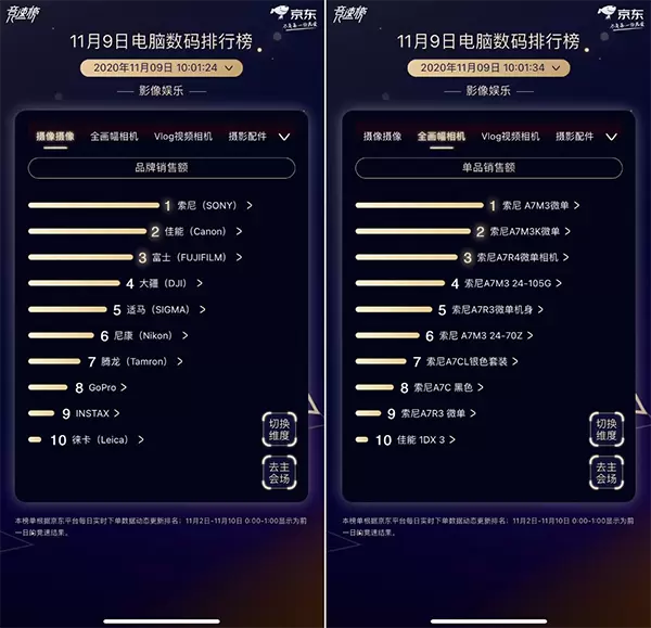昨日影像娱乐榜单排位发生微妙变化,大疆展现黑马之姿,打破了索佳尼三分天下局势。而今天,索尼、佳能、富士夺回摄影摄像榜单TOP3,大疆、适马、尼康在第二梯队持续发力,步步紧逼。索尼以压倒性的胜利称霸全画幅相机榜单前9位,以及Vlog视频相机类目前4位,得益于长期积累的产品力以及无数铁粉支持。富士、大疆、尼康、佳能蓄力待发,意图在最后的11.11战役中一争高下。