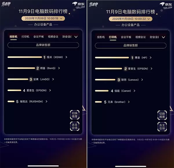 办公设备产品中,极米一骑绝尘,凭借产品口碑与品牌知名度牢牢锁定投影机产品头部席位;明基、坚果、爱普生位居其后对其形成威胁之势。爱普生与惠普也在打印机榜单中展开激烈较量,惠普以无线打印、激光打印、一体机等多款产品协同发力,暂时领先。