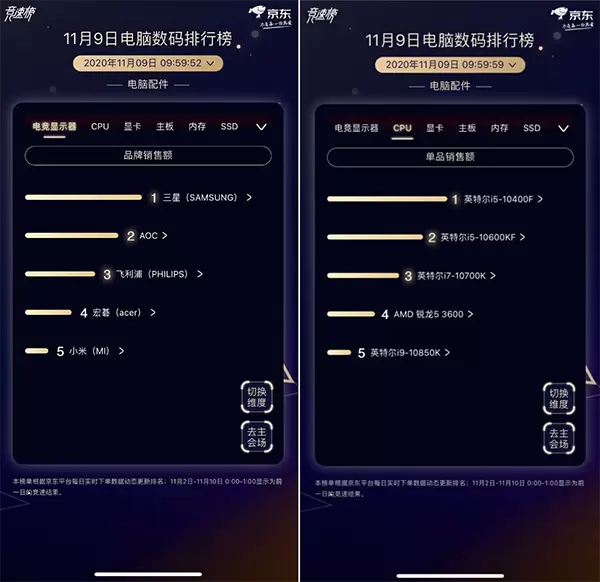 电脑配件的榜单排名同样不断上演着天翻地覆的变换。电竞显示器类目下,三星异军突起杀出重围,凭借创新曲率与超高分辨率的电竞屏,登顶冠军。AOC、飞利浦在第二、第三位已按捺不住,而昨日的冠军华硕已不在TOP5中。CPU榜单仍然是英特尔和AMD两家独大,你方唱罢我登场,头把交椅不断交替,二者对决激烈,誓要成为笑到最后的赢家。