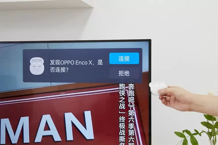 如果你恰好有个OPPO Enco X,当打开耳机充电盒盖子的一瞬间,OPPO智能电视R1上就会出现配对弹窗,完全不需要手动配对连接;搭配OPPO Enco X的入耳检测功能,摘下耳机电视便会自动暂停正在播放的内容,戴上后继续播放;而且还可以通过在耳柄上滑动调节音量。