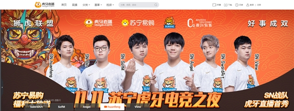 近日,苏宁易购与虎牙直播官宣首次达成官方合作,于11月11日19点正式推出双11电竞之夜,“最强黑马”SN战队的Sofm、Bin、huanfeng、Angel、View、Swordart等将全员入驻虎牙直播平台首秀。虎牙直播是拥有2亿注册用户、以游戏直播为主的弹幕式互动直播平台。此次狮虎联盟,将以看、玩、聊、买的形式,呈现一场娱乐性、体育性兼具,电竞选手、玩家、消费者齐聚一堂的狂欢之夜。
