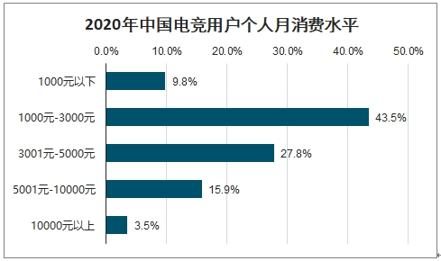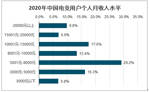 2020年我国电竞用户中,月收入在5000-8000元的高达29.2%,月消费在1000-3000元的高达43.5%。