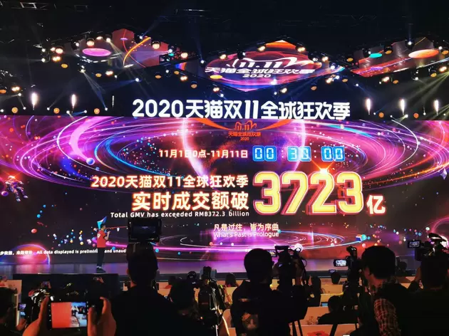 11月11日凌晨消息,在2020天猫双11全球狂欢季纪录之夜,11月1日至11月11日零点30分,天猫双11实时成交额破3723亿元。