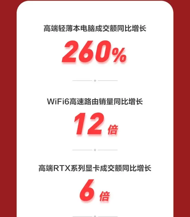 从京东电脑数码发布的高潮日当天数据可以看出,品质化、个性化成为驱动消费者购买的重要因素,开场前10分钟,高端轻薄本电脑成交额同比增长260%;音频品类方面,高端HiFi耳机成交额同比增长200%,尽显用户对视听效果的极致追求;此外,能够带来极致冲浪体验的WiFi6高速路由销量同比增长12倍,高端RTX系列显卡成交额同比增长6倍,高速固态硬盘成交额同比增长3倍,同样表现出色。